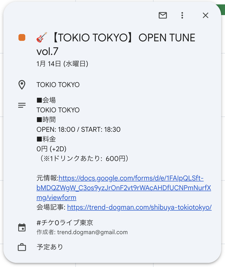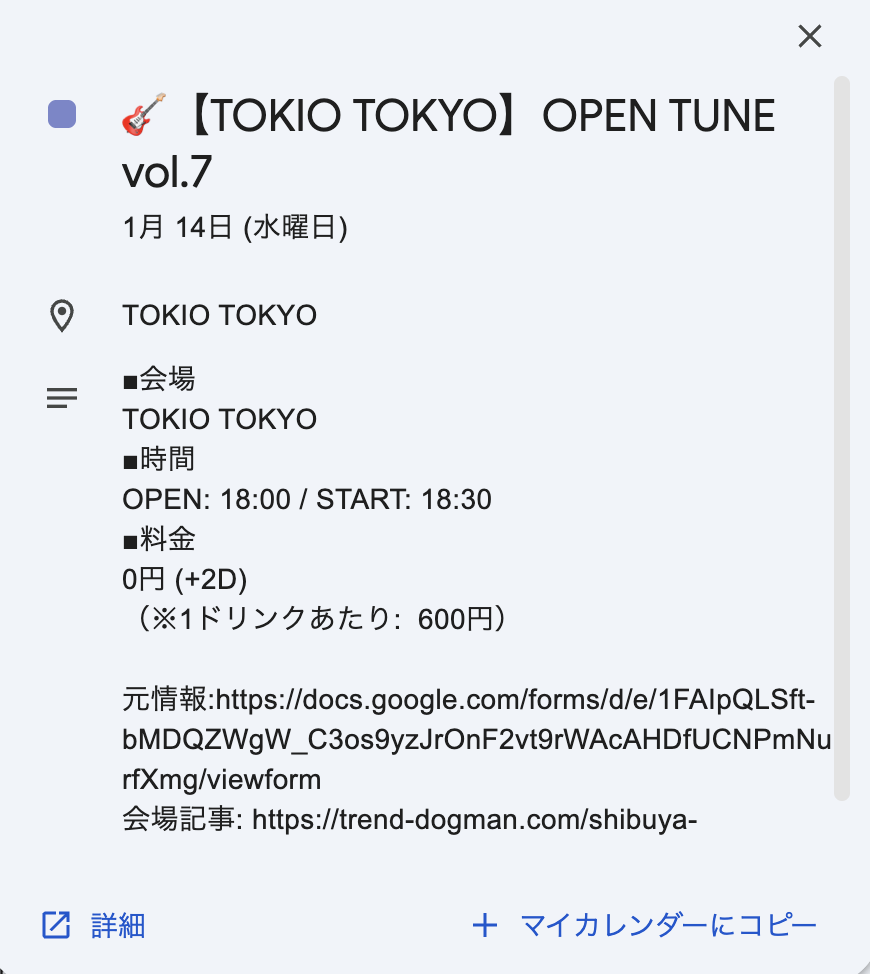 予定をタップすると、会場、時間、料金に関する情報と、予約リンクや会場記事リンクが表示されます。