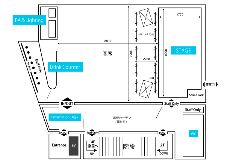 フロア内は段差がなくフラットですが、視界を遮る柱等はなくステージも高めなため、どの位置からでも比較的に見やすい点が特徴です。