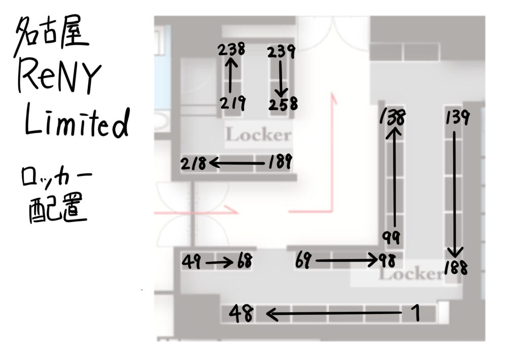 進行方向左手(No.189〜)のロッカーは女性用トイレの入り口(後述)があるため、右手のロッカーの使用を推奨します。
