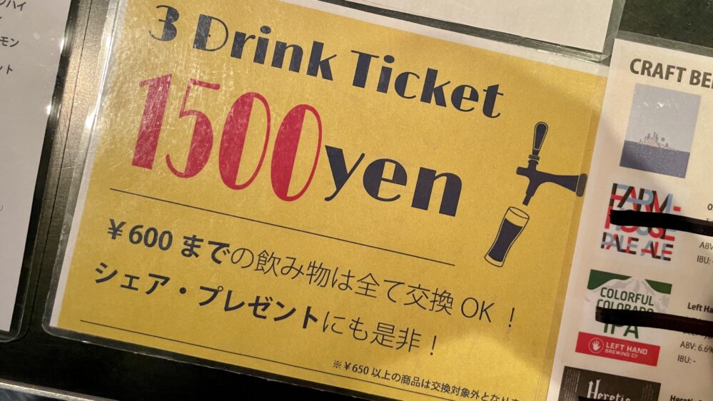 - 料金:1ドリンク600円、2ドリンク1200円、3ドリンク1500円