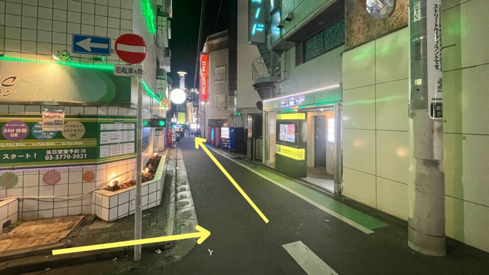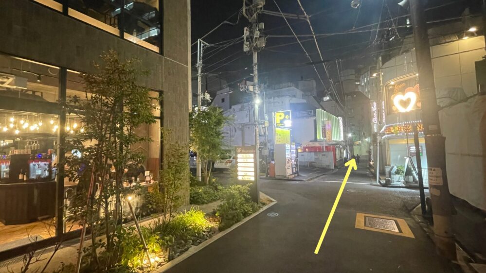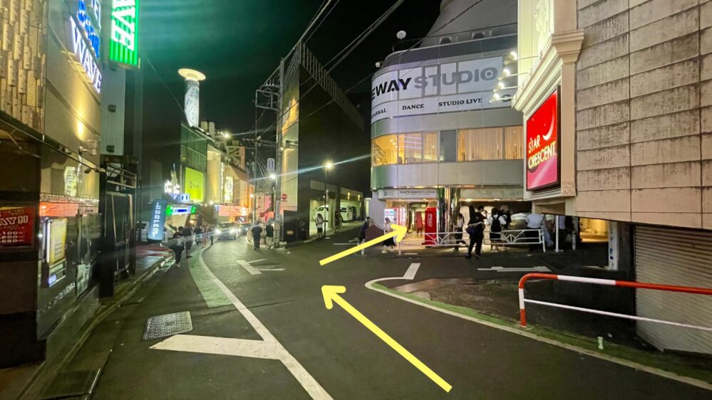 RINGを過ぎて見える渋谷百軒店のアーチ前の十字路。ここが今回のアクセスの基点です。