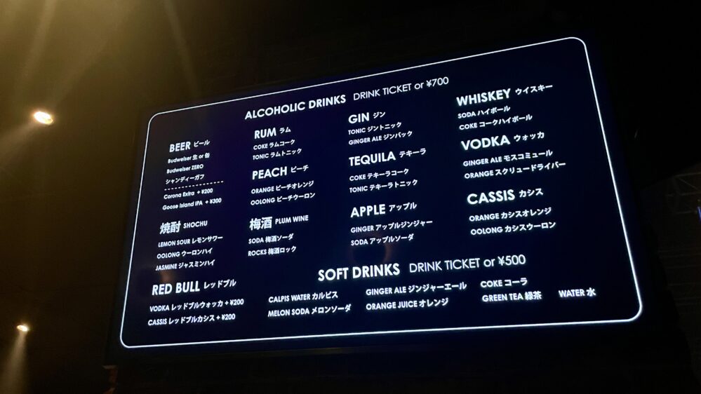 アルコールメニューはドリンクチケットまたは700円、ソフトドリンクはドリンクチケットまたは500円となっています。
