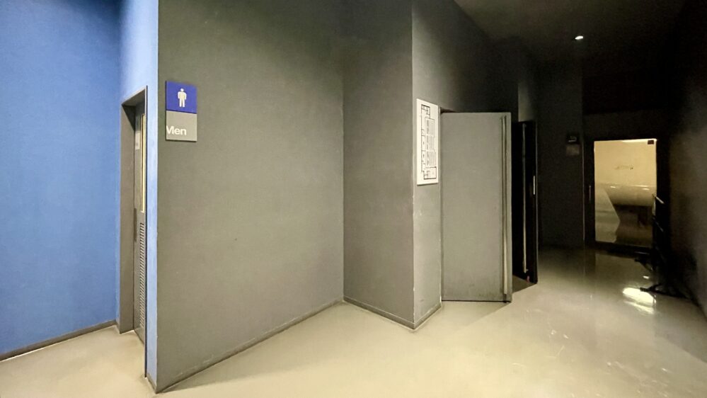 1階フロアには、ドリンクカウンター、男性用トイレ、女性用トイレ、多目的トイレ、喫煙所があり、ロッカーと両替機が設置されています。